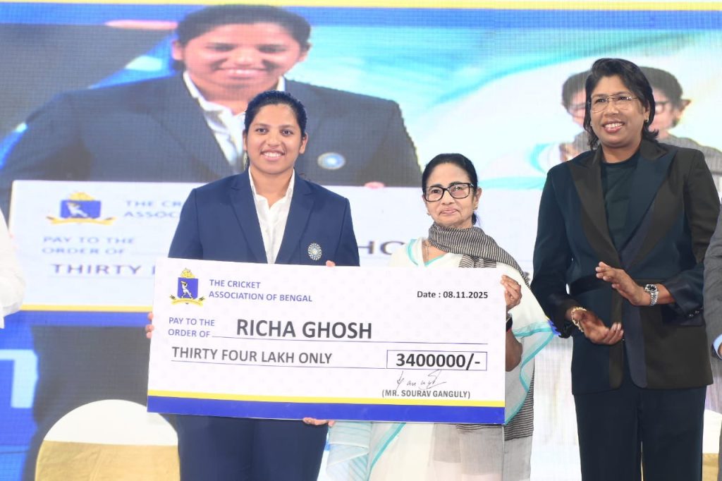 সৌরভ গঙ্গোপাধ্যায় বাংলার ক্রিকেটকে বিশ্বের দরবারে পরিচিত করলেও বাংলা থেকে প্রথম বিশ্বকাপ জয়ীর শিরোপা পেয়েছেন শিলিগুড়ির মেয়ে রিচা ঘোষ।‌ তাই খুব স্বাভাবিকভাবেই তাকে সম্বর্ধনা দেওয়ার জন্য কলকাতার ইডেন গার্ডেনসে বসলো রীতিমতো চাঁদের হাট। মুখ্যমন্ত্রী মমতা বন্দ্যোপাধ্যায়ের পাশাপাশি এই এদিনের সম্বর্ধনা অনুষ্ঠানে উপস্থিত ছিলেন ক্রীড়ামন্ত্রী অরূপ বিশ্বাস, প্রতিমন্ত্রী মনোজ তিওয়ারি, সিএবি সভাপতি তথা প্রাক্তন ভারত অধিনায়ক সৌরভ গঙ্গোপাধ্যায়, ঝুলন গোস্বামী-সহ একাধিক প্রাক্তন ক্রিকেটার, সিএবির অন্য পদাধিকারী। সিএবির তরফে রিচাকে প্রথমে উত্তরীয় তুলে দেওয়া হয়, তারপর ফুল-মিষ্টি। সোনার মেয়েকে শুভেচ্ছা জানাতে তাঁর হাতে তুলে দেওয়া হয় সোনার ব্যাট ও বল। যা তুলে দেন মুখ্যমন্ত্রী মমতা বন্দ্যোপাধ্যায়। আসল সারপ্রাইজ অবশ্য বাকি ছিল। এবার রাজ্য সরকারের তরফে রিচাকে রাজ্যের অন্যতম সেরা নাগরিক সম্মান বঙ্গভূষণ তুলে দিলেন মুখ্যমন্ত্রী। সেই সঙ্গে উত্তরীয় ও সোনার চেন। সেই সঙ্গে তাঁকে রাজ্য পুলিশে সাম্মানিক ডিএসপি পদও দেওয়া হয়েছে।