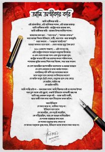 পোস্ট করা কবিতার শিরোনাম ‘আমি অস্বীকার করি’। কবিতার পরতে পরতে উঠে এসেছে রাষ্ট্রযন্ত্র, ক্ষমতা, ইতিহাস ও দায়বদ্ধতার প্রশ্ন। কোথাও সংখ্যার হিসাবকে অস্বীকার করে মানুষের মুখের কথা বলেছে কবিতা, কোথাও আবার ‘ক্ষমা’ আর ‘ভুলে যাওয়ার’ সংস্কৃতিকে সরাসরি চ্যালেঞ্জ করা হয়েছে। কবিতার ভাষায় বার বার ফিরে এসেছে ইতিহাসের সাক্ষ্য—কে দেখেছিল, কে চুপ করে ছিল, আর কে প্রতিবাদ করেনি।