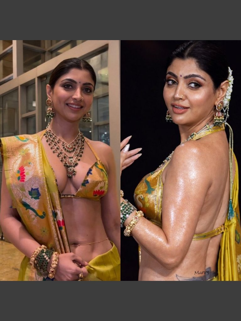 ভিডিওতে দেখা যাচ্ছে, সোনালি ঝলমলে পৈঠানী শাড়িতে মোড়া আকাঙ্ক্ষা। সূক্ষ্ম নকশা, ঐতিহ্যের ছোঁয়া—সবই ছিল নিখুঁত। কিন্তু হঠাৎই নজর আটকে যায় তাঁর ব্লাউজে। প্রচলিত ডিজাইনকে ছাপিয়ে তিনি বেছে নেন ব্যাকলেস, বিকিনি-স্টাইল ব্লাউজ—যা মুহূর্তেই লুকটিকে করে তোলে glamorous saree look-এর এক নতুন সংজ্ঞা।